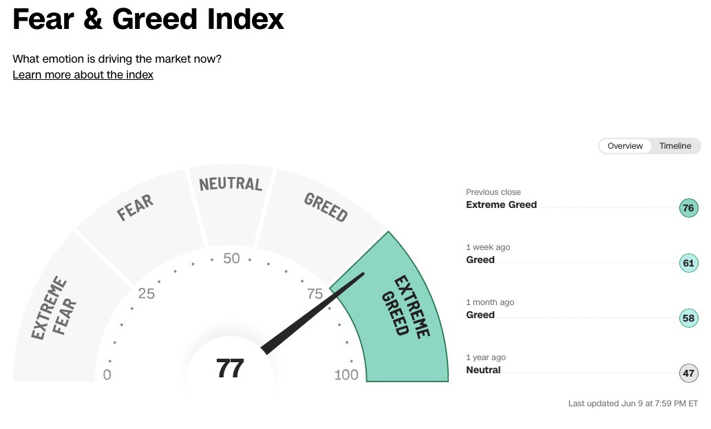 However, I am now raising a short-term caution flag. Media outlets constantly highlight the ongoing low volatility while the Fear & Greed index consistently reports high values: