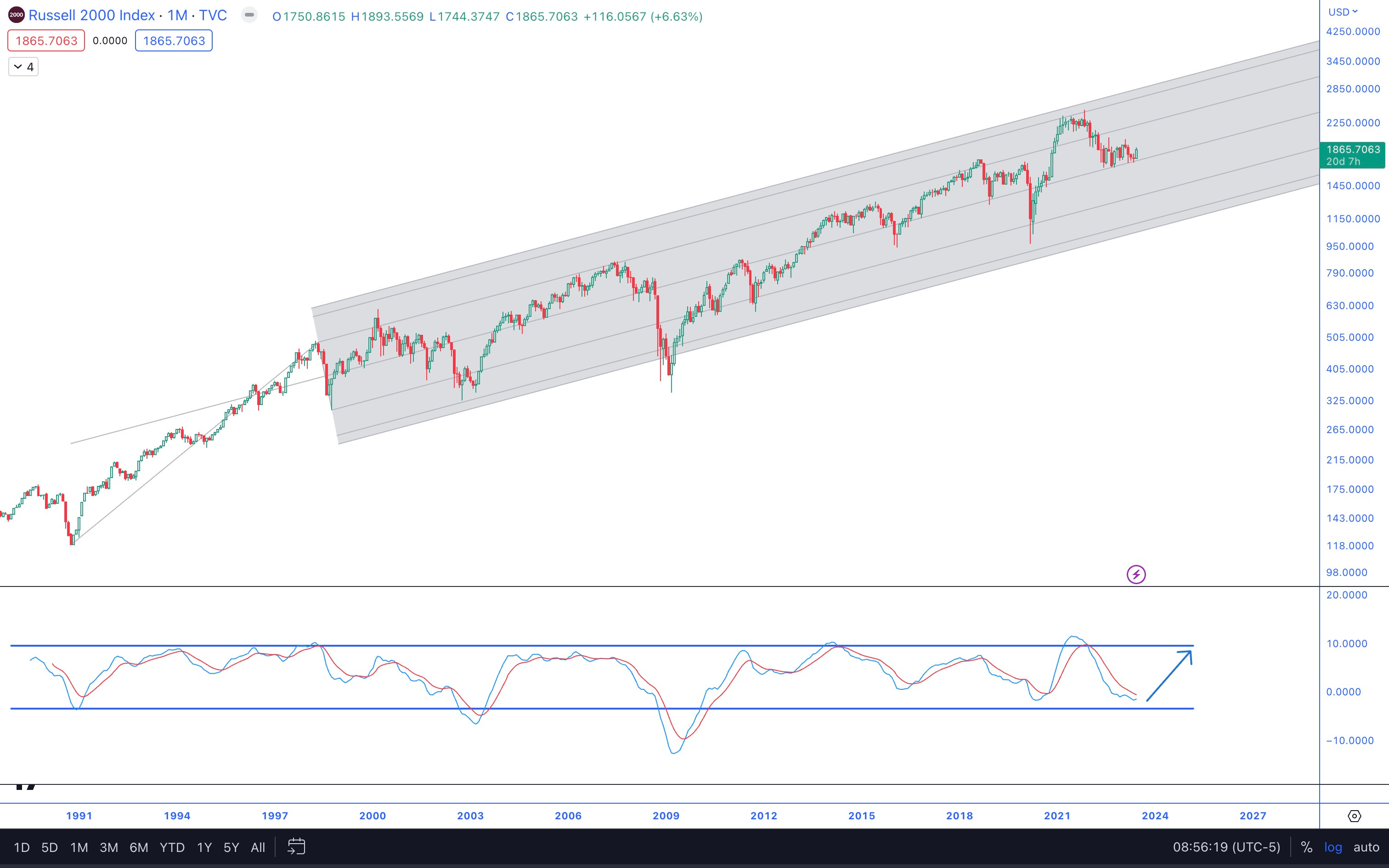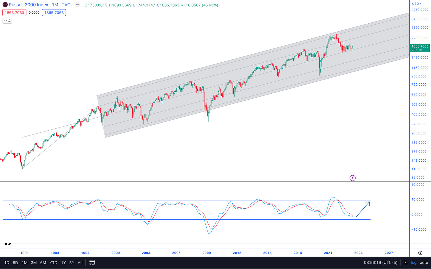 Examining small caps exclusively, I've incorporated a Schiff-style pitchfork onto the monthly RUT chart shown below: