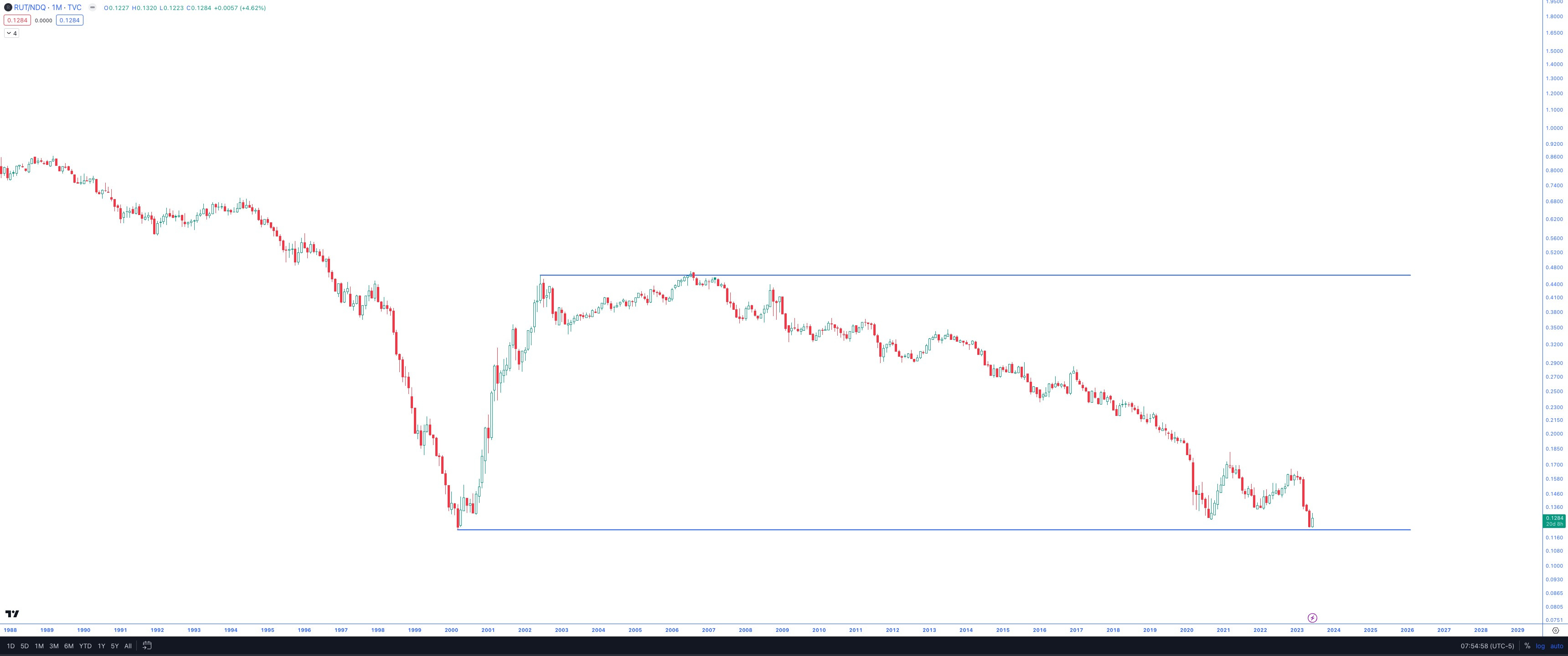 The historical RUT vs. NDX chart (monthly scale)